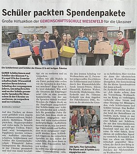 Vor Weihnachten nahmen einige unserer Klassen an einer Spendenaktion für die Ukraine teil. Auch die Zeitung berichtete davon (Artikel vom 04.01.2023).
